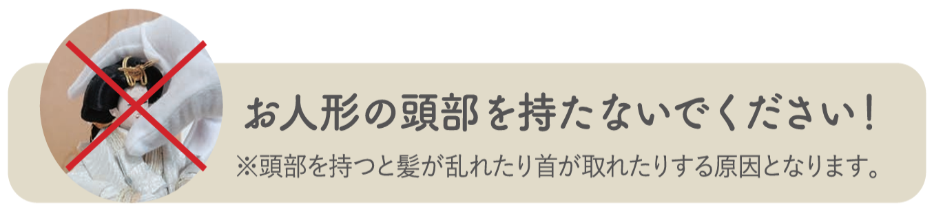- お人形の頭部を持つと破損や髪の乱れの原因になりますので、頭部を持たないでください。