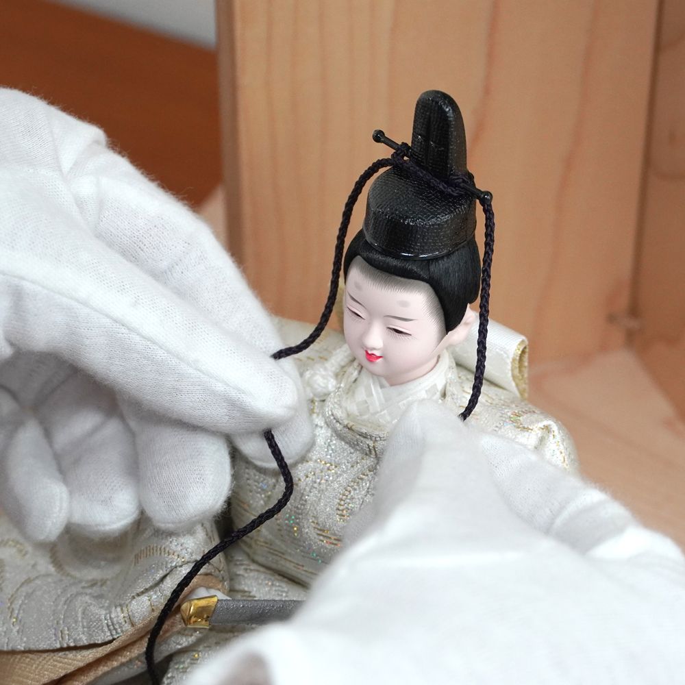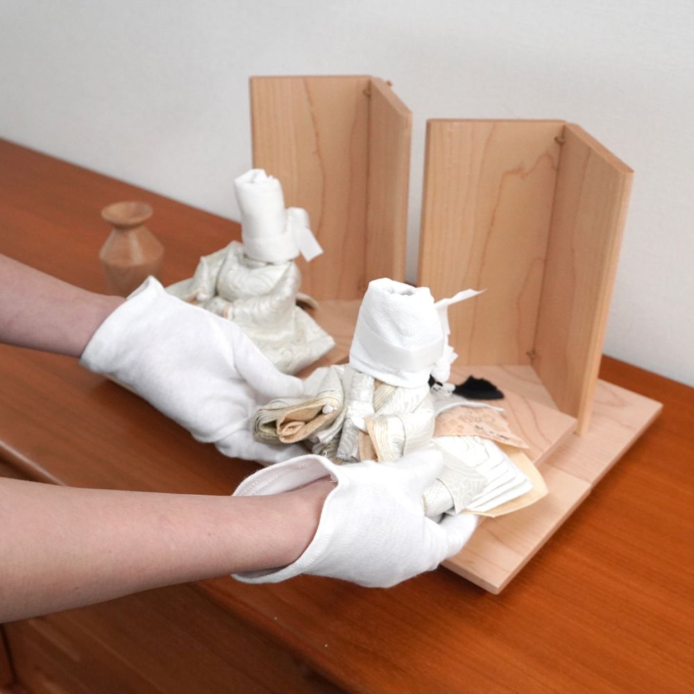 ②手袋を装着し、桐箱から取り出した人形を座布団の上に座らせます。
