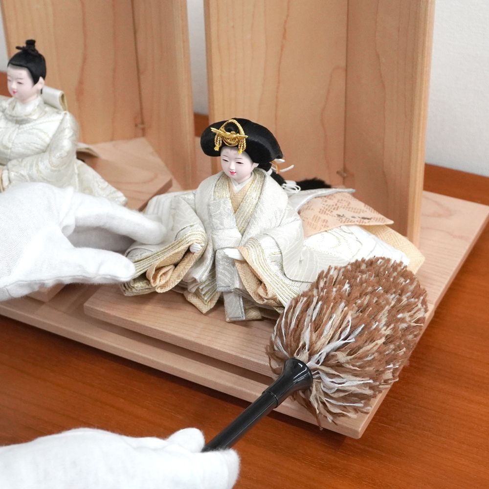 毛ばたきで人形などのホコリをはらいます。細かい部分は綿棒を使って取り除いてください。